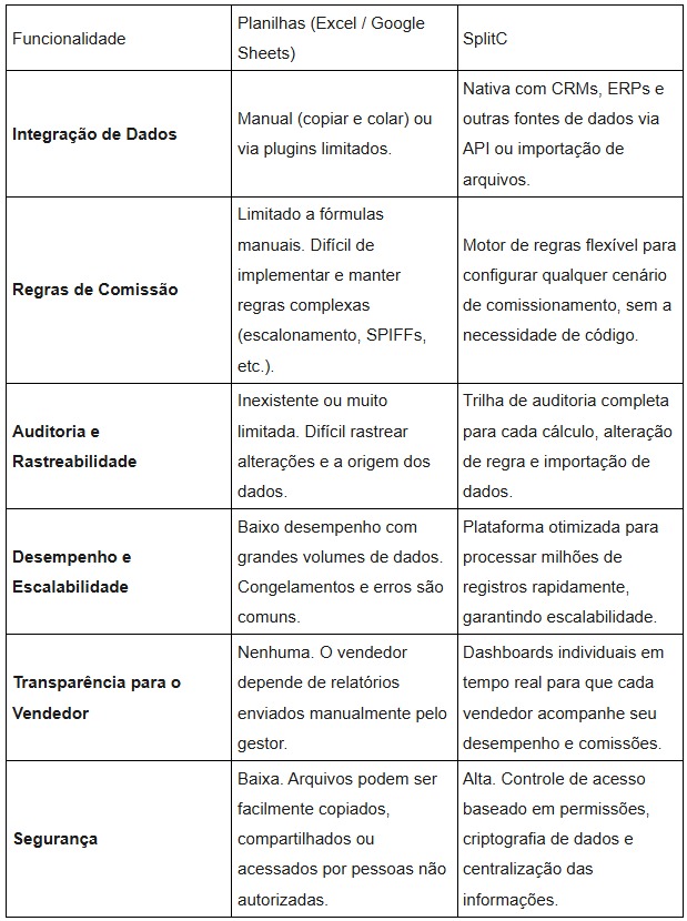 Para visualizar as diferenças, criamos uma tabela que compara as funcionalidades essenciais para o cálculo de comissões em planilhas e na plataforma SplitC.