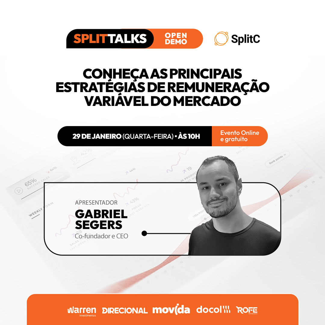 No SplitTalks 10, o Gabriel (CEO da SplitC) apresentou um panorama prático das principais estratégias de remuneração variável do mercado, com foco em incentivos de curto prazo (comissão, premiação, bônus de vendas). O encontro foi estruturado como conversa aberta, com enquetes e perguntas do público, e trouxe exemplos numéricos e modelos que aparecem com frequência na base da SplitC — sempre com o alerta de que não existe “receita pronta”: o melhor desenho depende do objetivo do negócio.