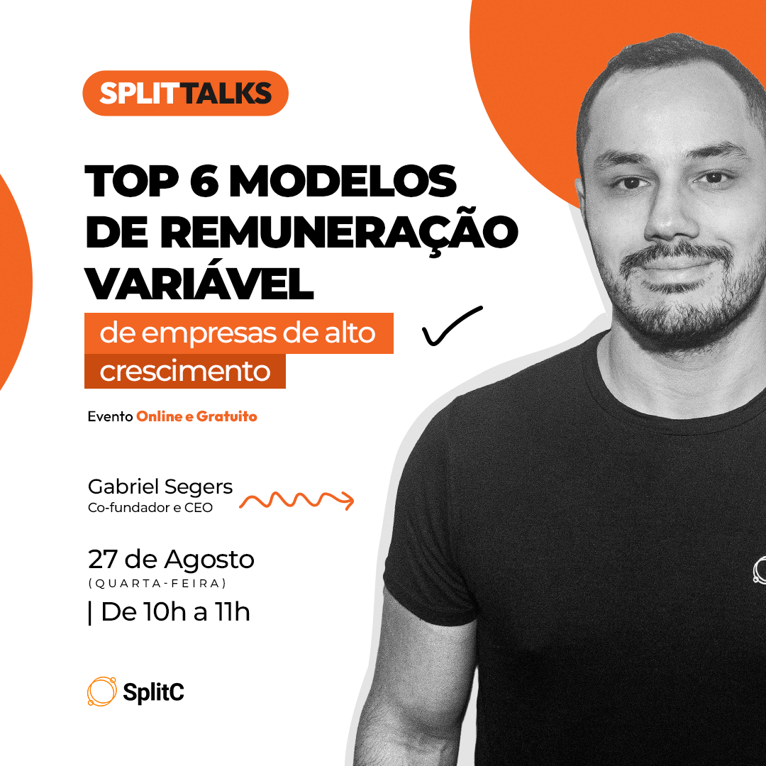 No SplitTalks 17, Gabriel apresenta um conteúdo “de consultoria” sobre os 6 modelos mais comuns de remuneração variável (RV) usados em empresas de alto crescimento, com fórmulas na prática, prós e contras, e exemplos por área/segmento. Ele reforça que a sessão é gravada, que o PDF seria liberado depois, e que ao final haveria trial de 14 dias + convite para a SplitC Academy/certificação (prática rápida de lógica/dados como PROCV e tabela dinâmica).